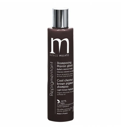 Shampooing Repigmentant Colorant Marron Glacé Patrice Mulato 200ml : shampooing Marron Glacé, reflets marrons froids, pour cheveux naturels ou colorés. Composé de beurre de karité bio, aux extraits de fruits et huile de tournesol. 92% d’ingrédients d’origine naturelle. 0% ammoniaque, eau oxygénée, silicone ou paraben.
