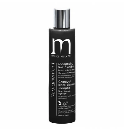 Shampooing Repigmentant Colorant Noir D’aniline Patrice Mulato 200ml : shampooing noir, reflets noirs intenses pour cheveux naturels ou colorés. Composé de beurre de karité bio, aux extraits de fruits et huile de tournesol. 92% d’ingrédients d’origine naturelle. 0% ammoniaque, eau oxygénée, silicone ou paraben.