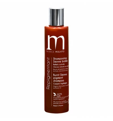 Shampooing Repigmentant Colorant Sienne Brûlée Patrice Mulato 200ml : shampooing sienne brûlée, reflets cuivrés pour cheveux naturels ou colorés. Composé de beurre de karité bio, aux extraits de fruits et huile de tournesol. 92% d’ingrédients d’origine naturelle. 0% ammoniaque, eau oxygénée, silicone ou paraben.