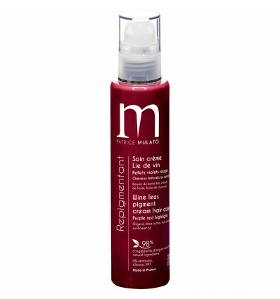 Soin Repigmentant Lie De Vin Patrice Mulato : soin crème lie de vin pour cheveux naturels ou colorés, reflets violets rouges. Composé de beurre de Karité bio, aux extraits de fruit et huile de tournesol. 98% d’ingrédients d’origine naturelle, 0% d’ammoniaque, eau oxygénée, silicone et paraben. Fabriqué en France.