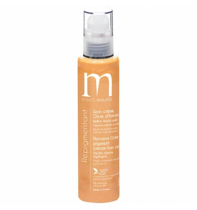 Soin Repigmentant Ocre D’havane Patrice Mulato : soin crème ocre d’havane, reflets blonds vanilles pour cheveux naturels ou colorés. Composé de beurre de Karité bio, aux extraits de fruit et huile de tournesol. 98% d’ingrédients d’origine naturelle, 0% d’ammoniaque, eau oxygénée, solicone et paraben. Fabriqué en France.