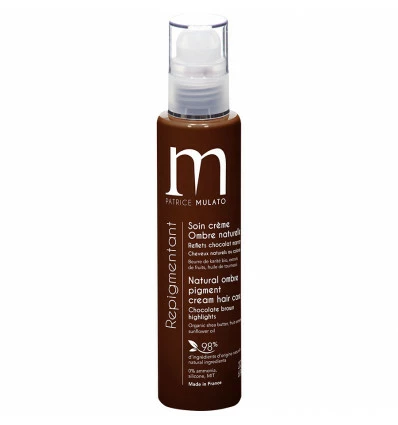 Soin Repigmentant Ombre Naturelle Patrice Mulato : soin crème ombre naturelle, reflets chocolat marron pour cheveux naturels ou colorés. Composé de beurre de Karité bio, aux extraits de fruit et huile de tournesol. 98% d’ingrédients d’origine naturelle, 0% d’ammoniaque, eau oxygénée, solicone et paraben. Fabriqué en France.